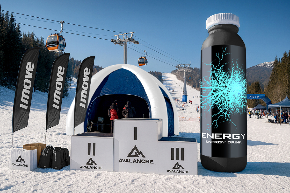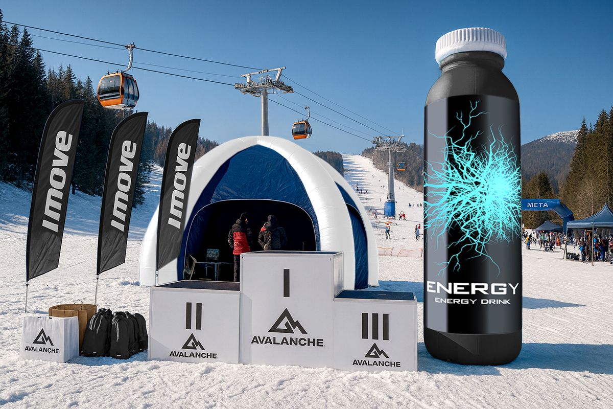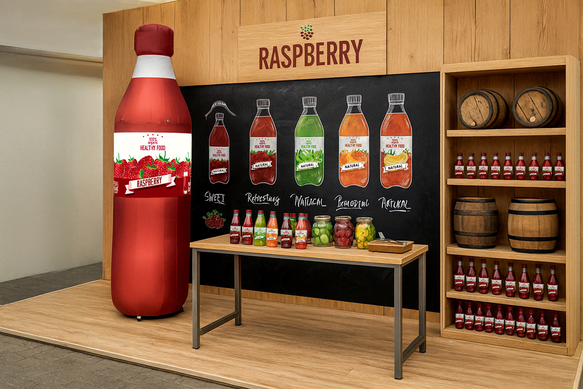 Aufblasbare Werbeflasche auf Basis einer Konstantdruckkonstruktion – ein einziges Aufpumpen reicht aus, damit die Flasche während der gesamten Veranstaltung ihre Form behält. Da sie unabhängig von Strom ist, gibt es kein Risiko von Ausfällen, Kabelsalat oder Einschränkungen durch die technische Infrastruktur. So kann jeder Raum – selbst schwer zugängliche – zu einem Ort werden, an dem die Marke präsentiert werden kann und die Blicke und Aufmerksamkeit der Besucher auf sich zieht.