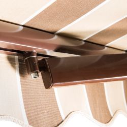 Optionen:Elektromotor, Fernbedienung zur Steuerung, LED Beleuchtung in den Streben, Schutzdach, Teleskopstützen zur Stabilisierung der Markisenkonstruktion – nicht in Verbindung mit der Wetterstation verwendbar, Wetterstation
