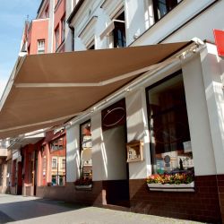 Die Halbkassettenmarkise ist eine Art Überdachung für Restaurantgärten oder Cafés. Die hochwertige Kassette schützt den Stoff vor Beschädigungen. Diese Lösung ermöglicht einen höheren Nutzungskomfort und trägt dazu bei, die natürliche Farbe der Markise unabhängig von den Wetterbedingungen zu erhalten. Das Markisentuch ist im geschlossenen Zustand vollständig in der Kassette verstaut, von unten sind nur Arme sichtbar, die aus korrosionsbeständigem Aluminium gefertigt sind. Die Kassette hat auch eine ästhetische Funktion.