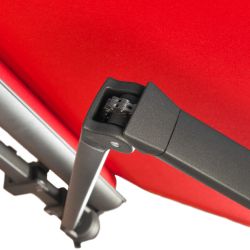 Optionen:Elektromotor, Fernbedienung zur Steuerung, LED Beleuchtung in den Streben, Schutzdach, Teleskopstützen zur Stabilisierung der Markisenkonstruktion – nicht in Verbindung mit der Wetterstation verwendbar, Wetterstation